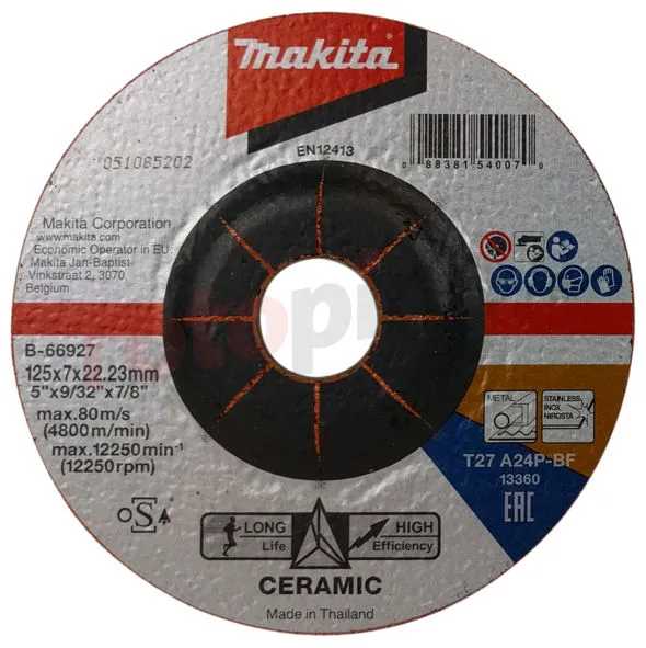 Le disque de meulage Makita T27 A24P BP pour le métal et l’acier inoxydable fera ses preuves dans le travail professionnel effectué avec l’utilisation d’une meuleuse d’angle de 125mm. Le disque a un grain en céramique qui assure une efficacité de meulage élevée. Grâce au montage universel, il fonctionnera avec des meuleuses d’angle de différents fabricants.