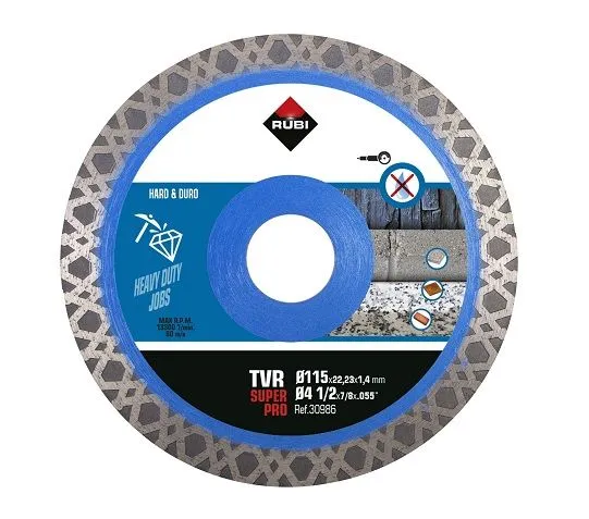 Disque diamanté TURBO VIPER – TVR SUPERPRO Rubi 30986 est un accessoire professionnel pour la coupe à sec du granit, des carreaux en pierre rustique, des matériaux réfractaires, de l’ardoise et du grès cérame. Le disque TVR avec bordures diamantées soudées au laser se caractérise par une fabrication de haute qualité et une sécurité d’utilisation. Grâce à sa construction de jante entrelacée (Turbo combiné à un grain continu), elle se caractérise par sa rapidité et sa précision de coupe. Grâce au renforcement central du disque, il est plus résistant à la flexion. Ce disque est recommandé pour les applications les plus exigeantes.