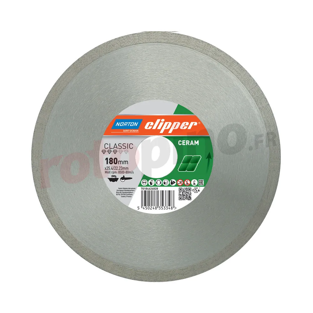 Disque diamant 180×25,4 / 22,23mm Norton Classic Ceram avec rebond continue, conçue pour la découpe de porcelaine dure et sèche et de céramique.