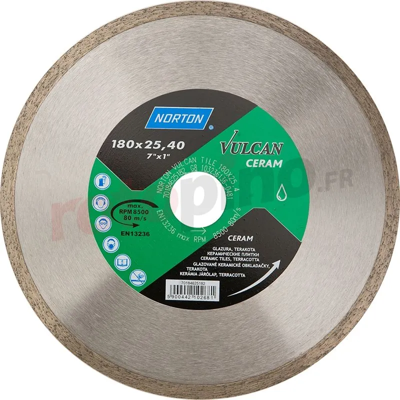 Disque diamant 250×25,4mm Norton PRO Ceramic avec bord continu conçue pour couper les carreaux de céramique, de granit, de marbre, d’ardoise et de pierre humides et secs. La haute qualité du segment de diamant permet une coupe efficace en utilisant des coupe-carreaux stationnaires.