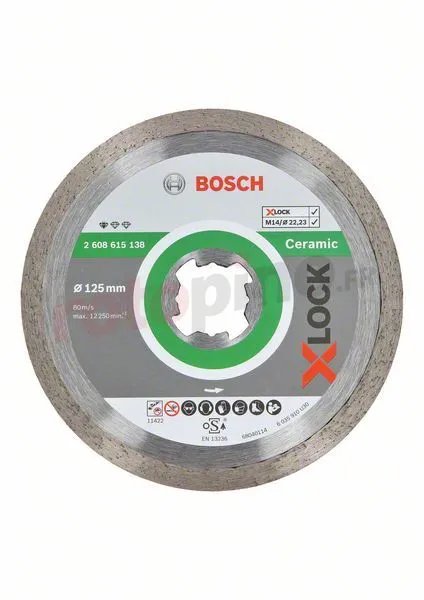 Disque diamant Standard pour céramique Bosch 2608615138 offre une fixation innovante et sans outil des accessoires X-Lock. La lame convient aux meuleuses Bosch avec le système X-Lock, mais également aux meuleuses avec une queue filetée M14 traditionnelle.