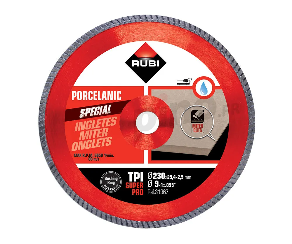 Le disque diamant SUPERPRO TPI Rubi 31967 est conçu pour couper en biais le grès cérame. L’épaisseur du disque de 2,5mm permet de chanfreiner sans utiliser de plaques de renforcement spéciales, et leur utilisation peut aider à obtenir la plus haute précision de coupe possible. Le disque de coupe de biais de la série SUPERPRO est recommandé pour les applications exigeantes. Il a un bord TURBO, ce qui nécessite que la ligne de coupe soit dirigée à environ 1-2mm en dessous du bord d’origine du carreau, ce qui permet d’éviter de perturber la couche de vitrage. La jante en diamant de la lame est fixée au disque métallique par soudage laser, ce qui la rend très durable et assure une coupe sûre.